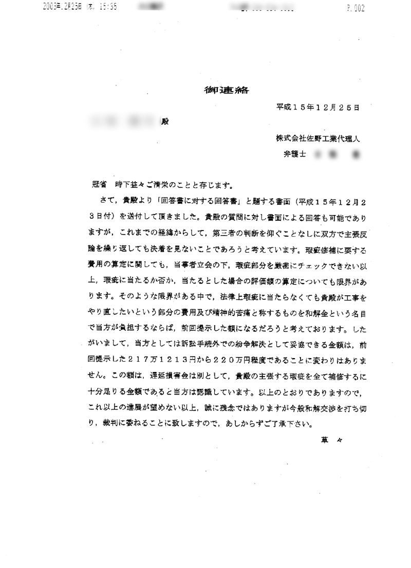 まあ、内容をみる限り何度となく、riki達に裁判という言葉をみせ、裁判という言葉からなんとか最初に佐野工業が出した金額で妥協させようと試みたがどうしようもないので最後の手段として和解交渉を打ち切り裁判に持っていきますよ、いまならまだ間に合いますよということを言ってきているのだろうと思います。