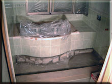 | 浴室のタイルが張られました。職人の技ですね。 | 2日たつとこんなに変わってしまうんですね…。 |