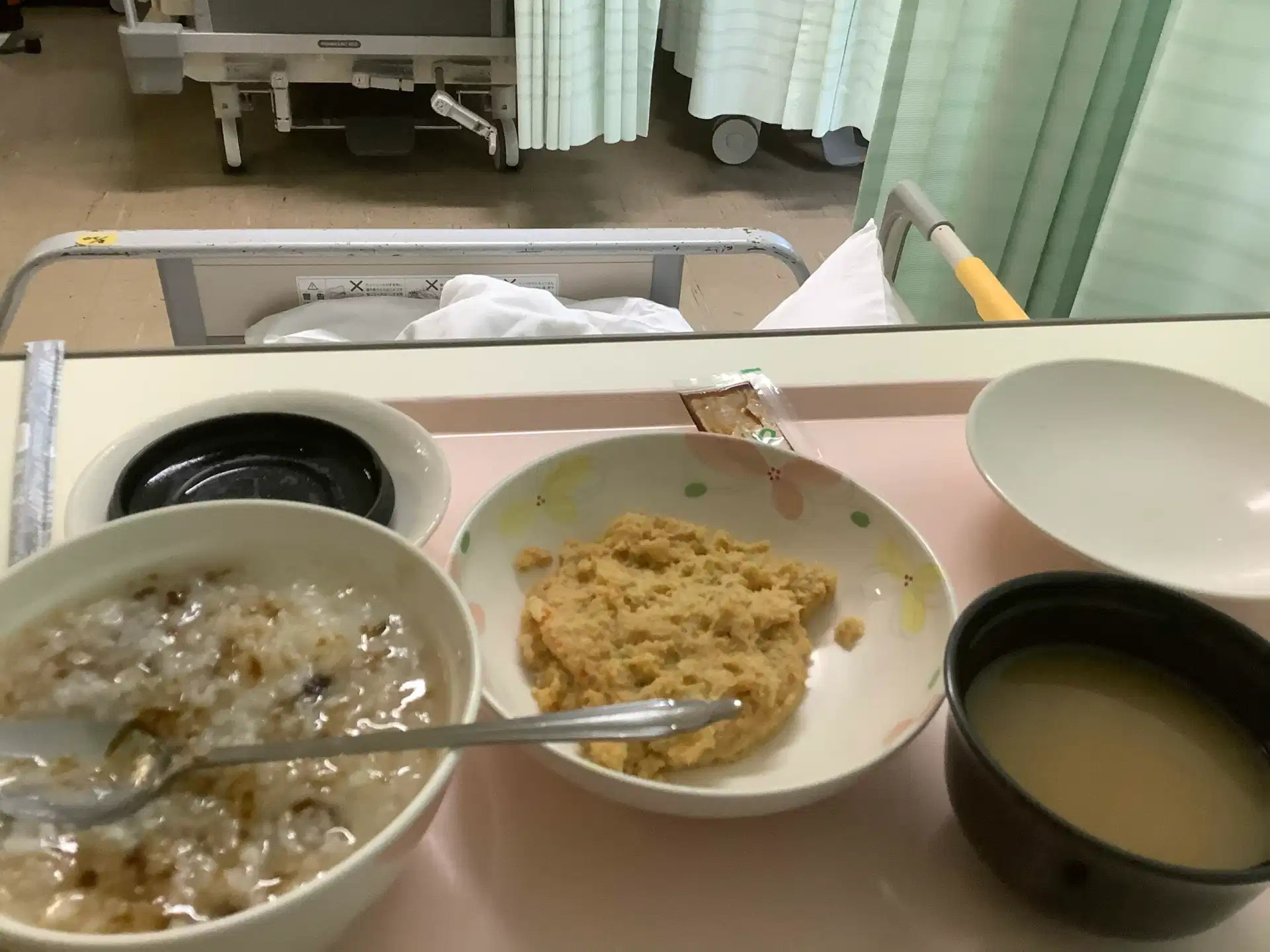この様子を見ていた夜勤を担当してくれた看護師さんがやってきて、「rikiさん、のど通すときに引っかかる感じで苦しいですよね…。ご飯を変えてもらうようにしますね。」といって、看護師さんに「rikiさんのご飯をお昼からおかゆにしてあげてください」と指示してくれました。あぁほんとにいい看護師さんだ…。