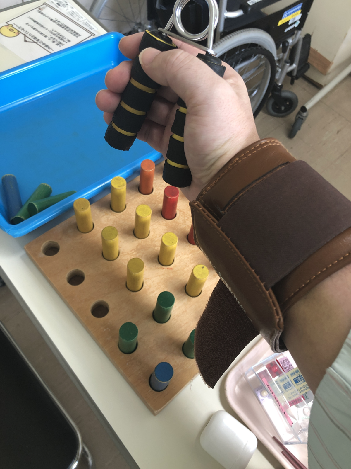 午後は手のリハビリでした。午前中にMさんと会話をしていた内容をSさんにも伝えてくれていたみたいで、rikiさん、「rikiさん、この部屋久しぶりですね!頑張って自立歩行の練習しましょう!」と、リハビリ室をひたすら歩きました。そのあとはいつもと同じ手の方のリハビリを行いました。リハビリの最後のほうでSさんから「明日、手の方のテストを行います。入院の時に行ったのと同じテストです。」